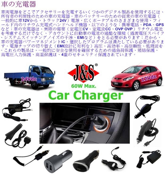 12. EMC&安全規格:ROHS / CE / E-MARK。| Output Power | Output Voltage | Output Current | Color | One Port USB Type | Two Port USB Type | DC Plug Type |